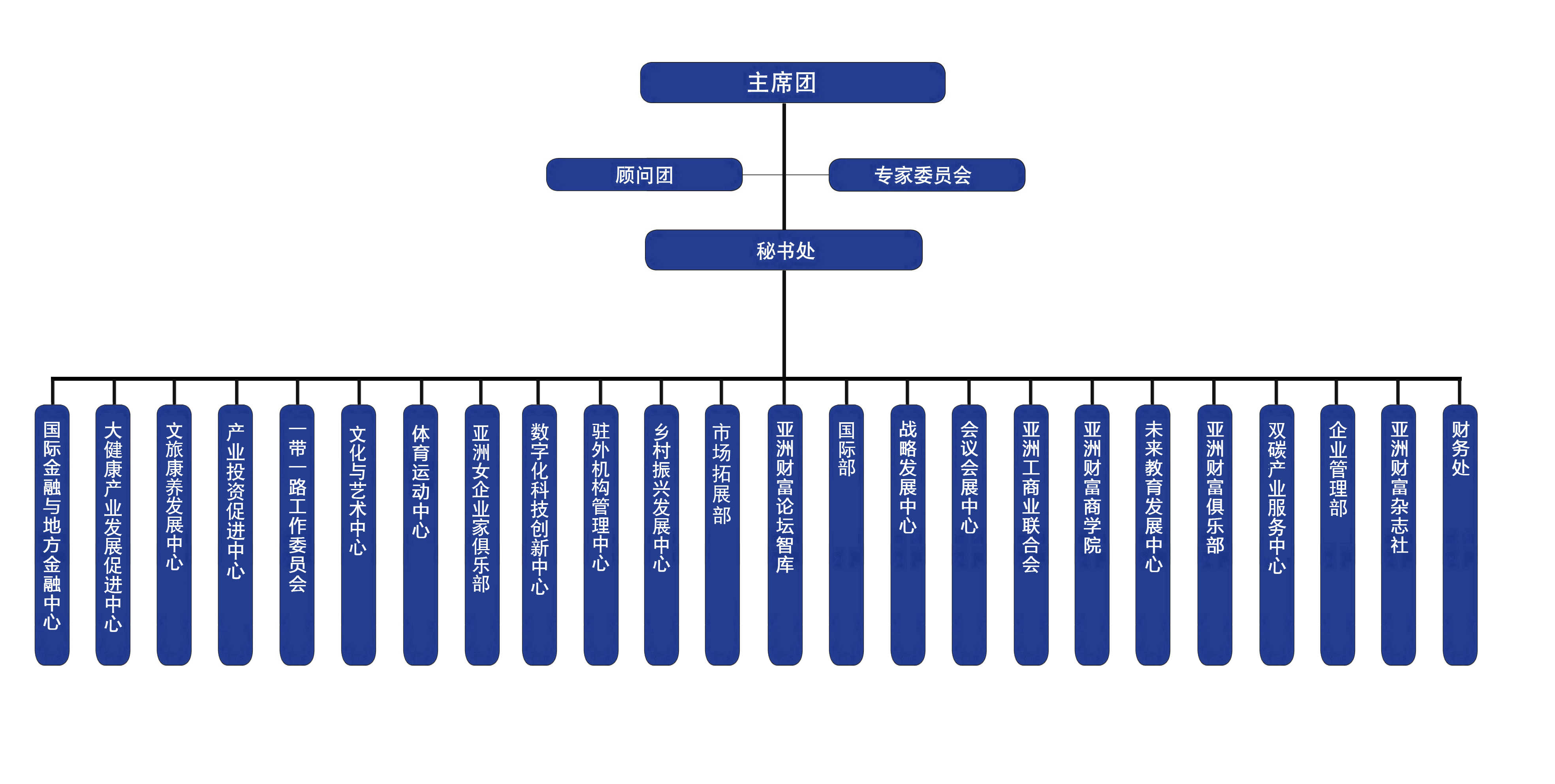 亚洲财富论坛由主席团、顾问团、专家委员会、秘书处下属24个职能部门及25个国家驻外联络处组成;