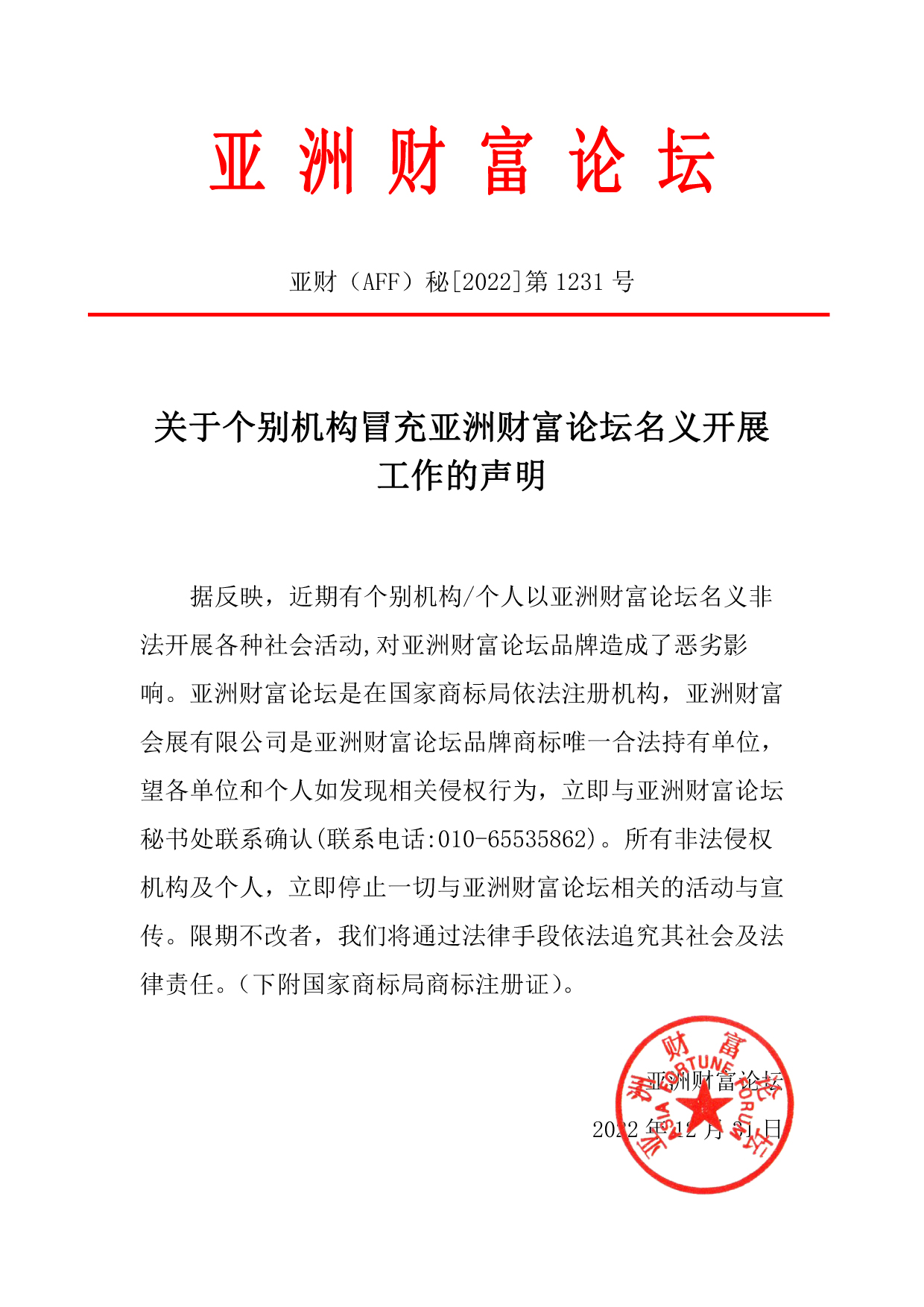 关于个别机构冒充亚洲财富论坛名义开展工作的声明