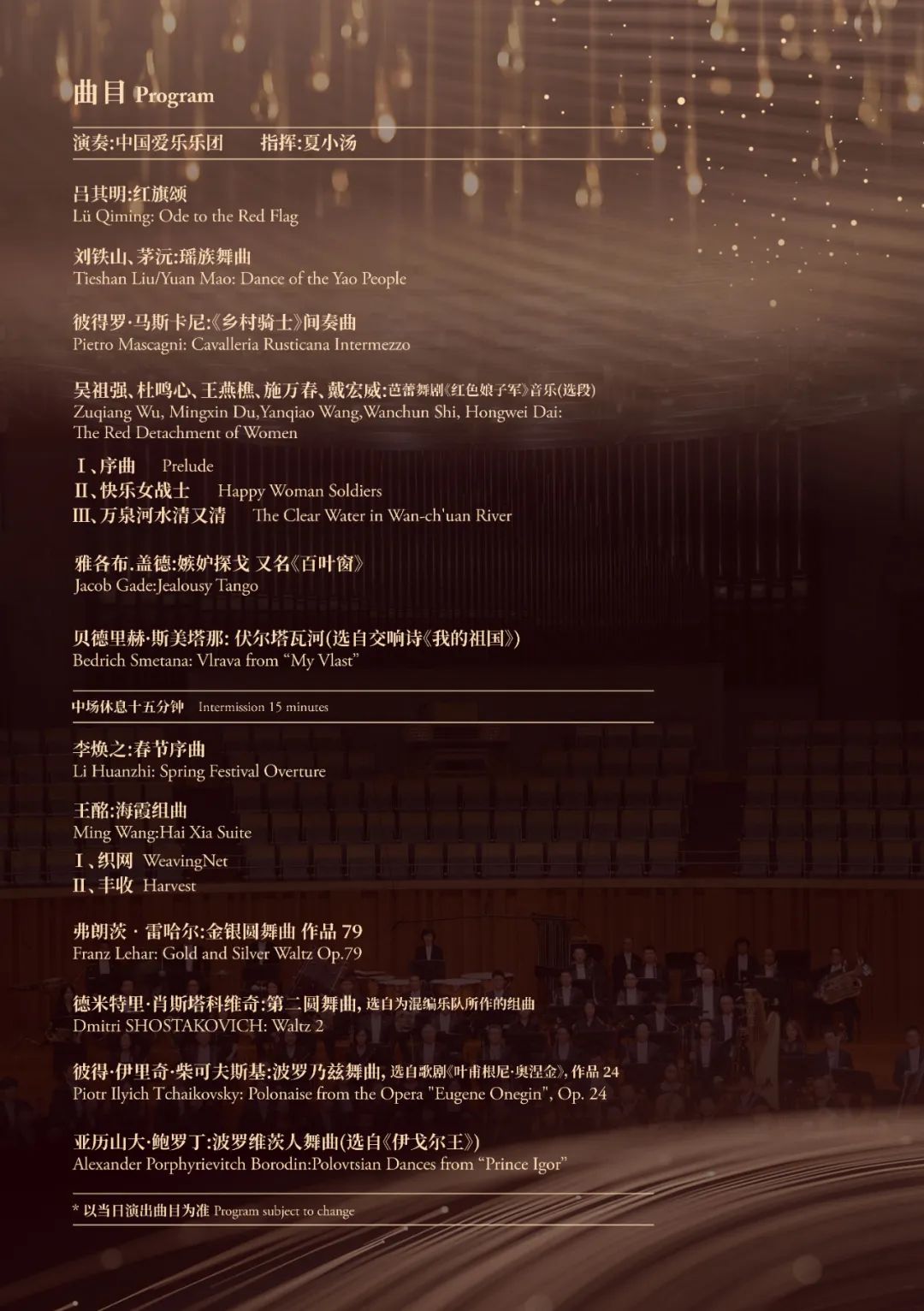 与新千年共同肇始的中国爱乐乐团已走过了二十三年的历程,历经二十二个音乐季。二十三年走来,实现了“中国一流,亚洲前列,世界著名”的既定目标,完成了历史性的提升和跨越。