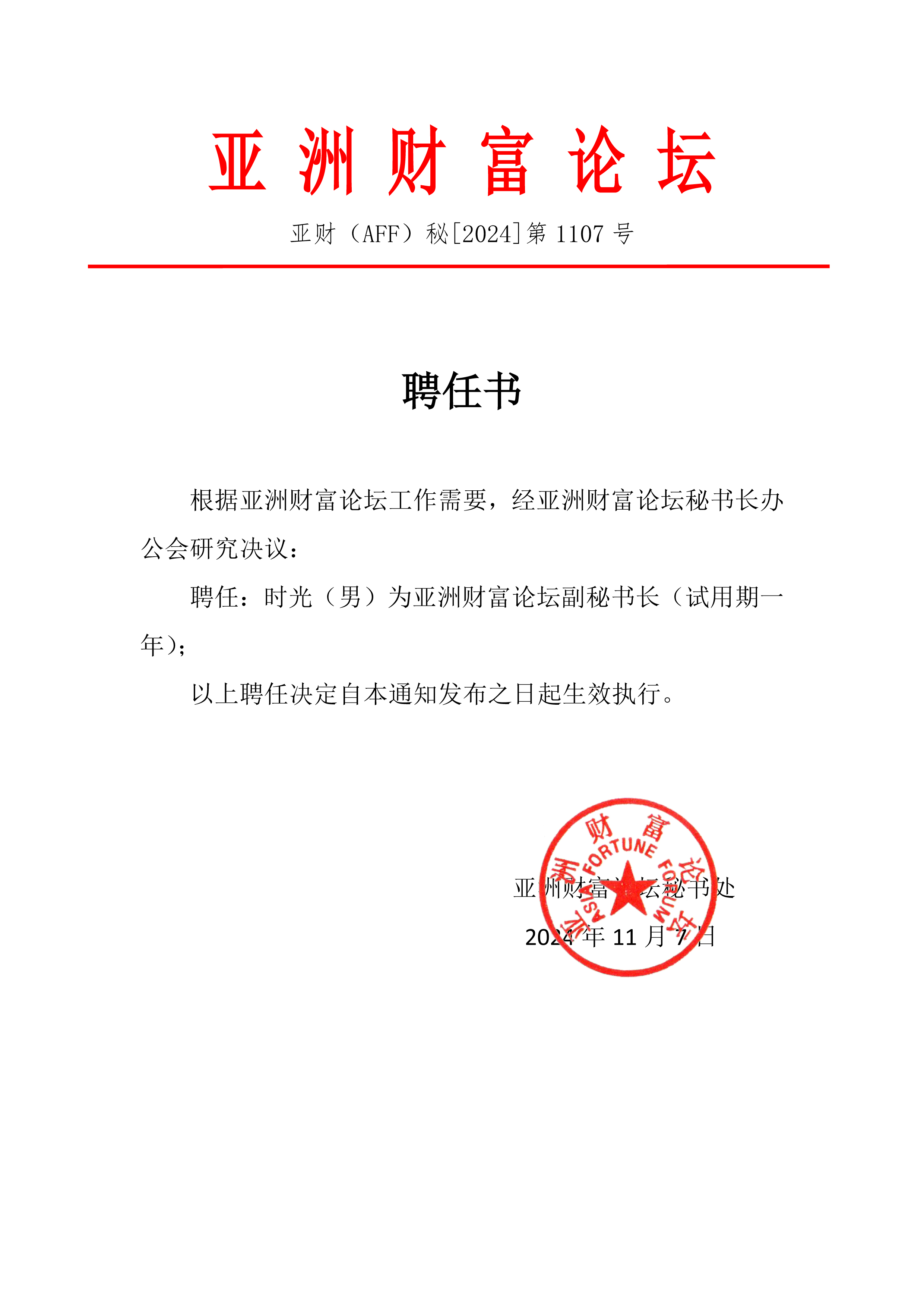 聘任时光(男)为亚洲财富论坛秘书处副秘书长