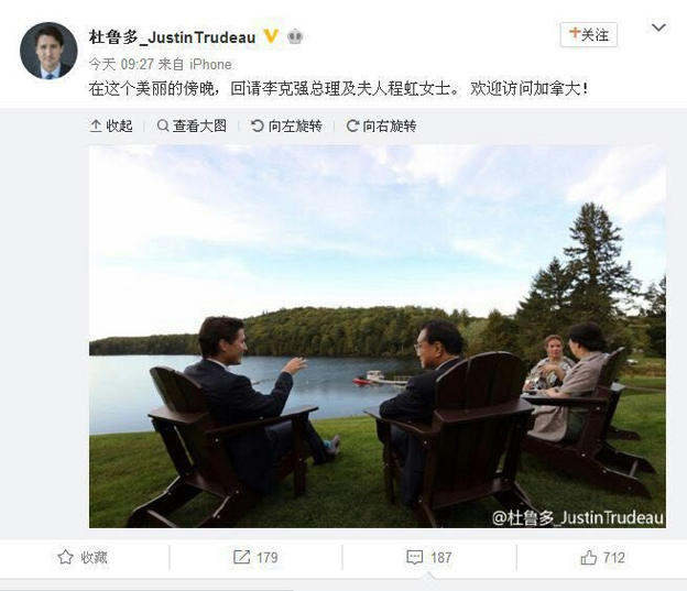 Local time on the evening of 21, Premier Li Keqiang arrived in Canada after two hours, the Canadian Prime Minister Trudeau released a photo of talking with Li Keqiang and his wife by the lake on his micro-blog and Twitter account, and wrote:“In this beautiful evening, return hospitality Premier Li Keqiang and his wife Ms. Cheng Hong. Welcome to Canada!” 20 days ago, Li Keqiang has just met with Trudeau in Beijing.