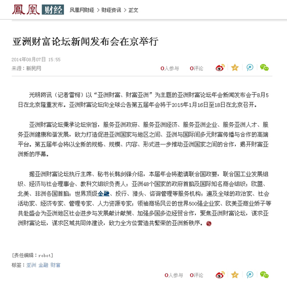 凤凰财经对亚洲财富论坛第五届年会新闻发布会的报道