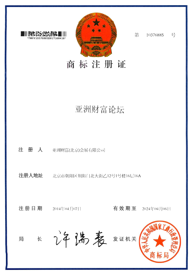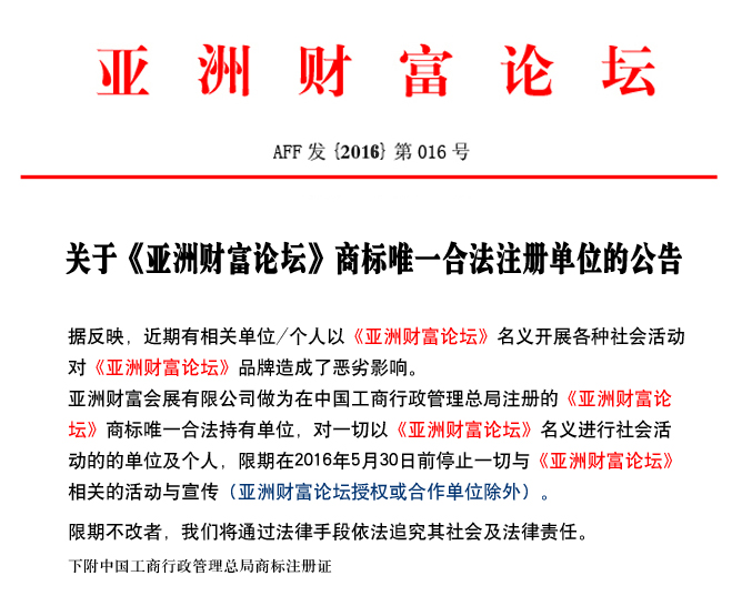 关于《亚洲财富论坛》商标唯一合法注册单位的公告
